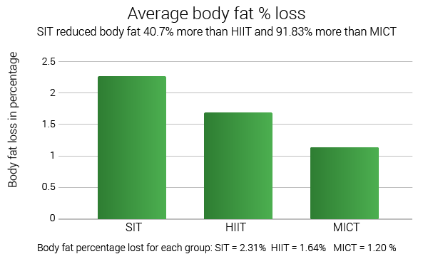 A recent meta-analysis comparing HIIT to MICT also showed greater reductions in total absolute fat mass with the interval training5. In one study, a group of women performing the Trapp method 3x/week for 15 weeks experienced similar increases in aerobic fitness to those who performed a steady-state endurance training program (60% intensity for up to 40mins). But notably the interval training group also reduced total body mass and fat mass, especially around the trunk and legs6.
